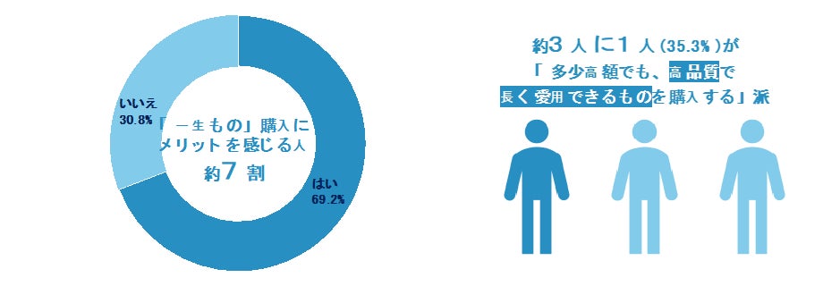① 約7割の人が「一生もの」の購入にメリットを感じることが判明。普段の買い物で「多少高額でも、高品質で長く愛用できるものを購入する」派は約3人に1人。