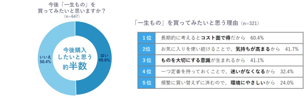 一方、「いいえ」と答えた人に「今後購入したいと思うか」を質問すると、「はい」が49.6%という結果に。現在「一生もの」を持たない人の中でも、約半数が今後の購入を検討していることが明らかになりました。