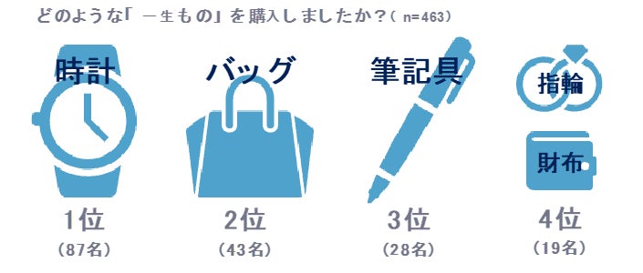 「日常的に使うもの(住宅・自動車は除く)で『一生もの』を購入したことがある」と回答した人に対し、「どのような商品を購入しましたか?具体的にお答えください。」と質問をしたところ、463名から回答があり、下記のような結果に。「時計」「バッグ」といった定番のものに次いで、万年筆やボールペンなどの「筆記具」が3位にランクインしました。