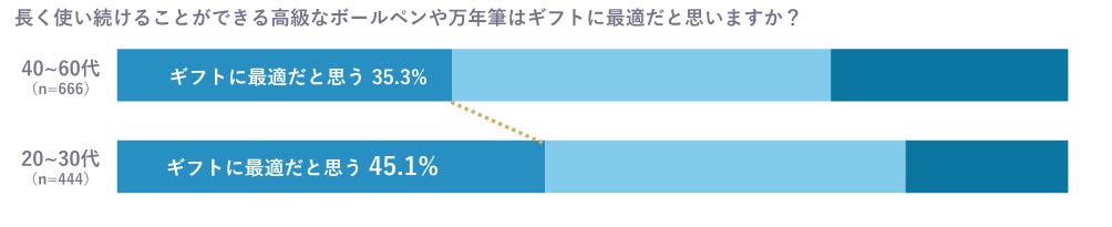 「長く使い続けることができる高級なボールペンや万年筆はギフトに最適だと思う」の項目に対し、「はい」 は40~60代では35.3%でしたが、20~30代は45.1%と、10ポイント近く差をつけていました。