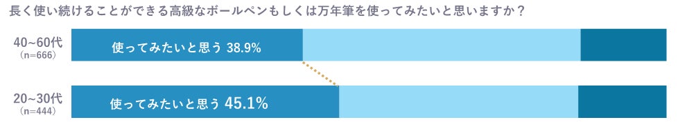 「長く使い続けることができる高級なボールペンもしくは万年筆を使ってみたいと思う」の項目に対し、「はい」は40~60代では 38.9%でしたが、20~30代は45.1%と6ポイント以上差がつきました。