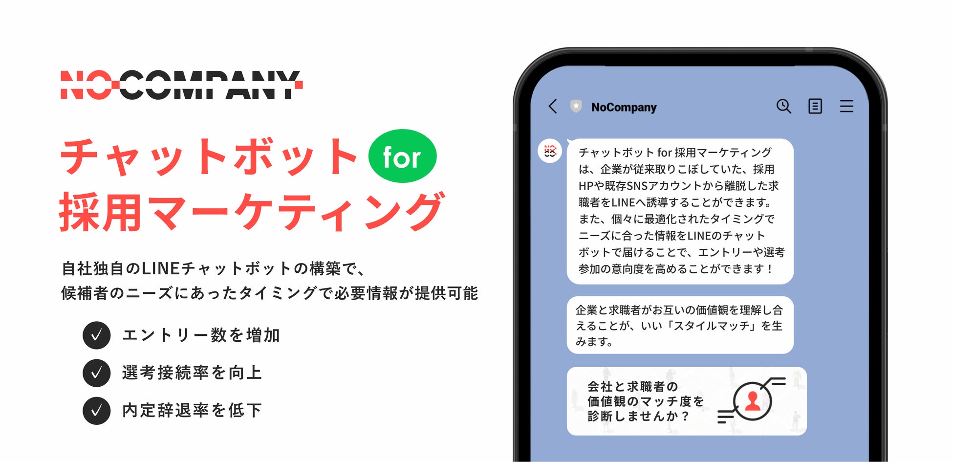 企業の人事部門向けに採用広報(採用マーケティング)支援を行う株式会社No Company(本社:東京都港区、代表取締役:秋山真)は、このたび、新卒・キャリア採用を行う企業向けに、採用マーケティング支援サービス「チャットボット for 採用マーケティング」の提供を開始します。本サービスは、LINE公式アカウント上において、採用情報発信に特化したチャットボット機能を搭載して企業に提供するもので、企業は各学生や求職者が知りたい情報を知りたいタイミングで自動配信できるようになります。