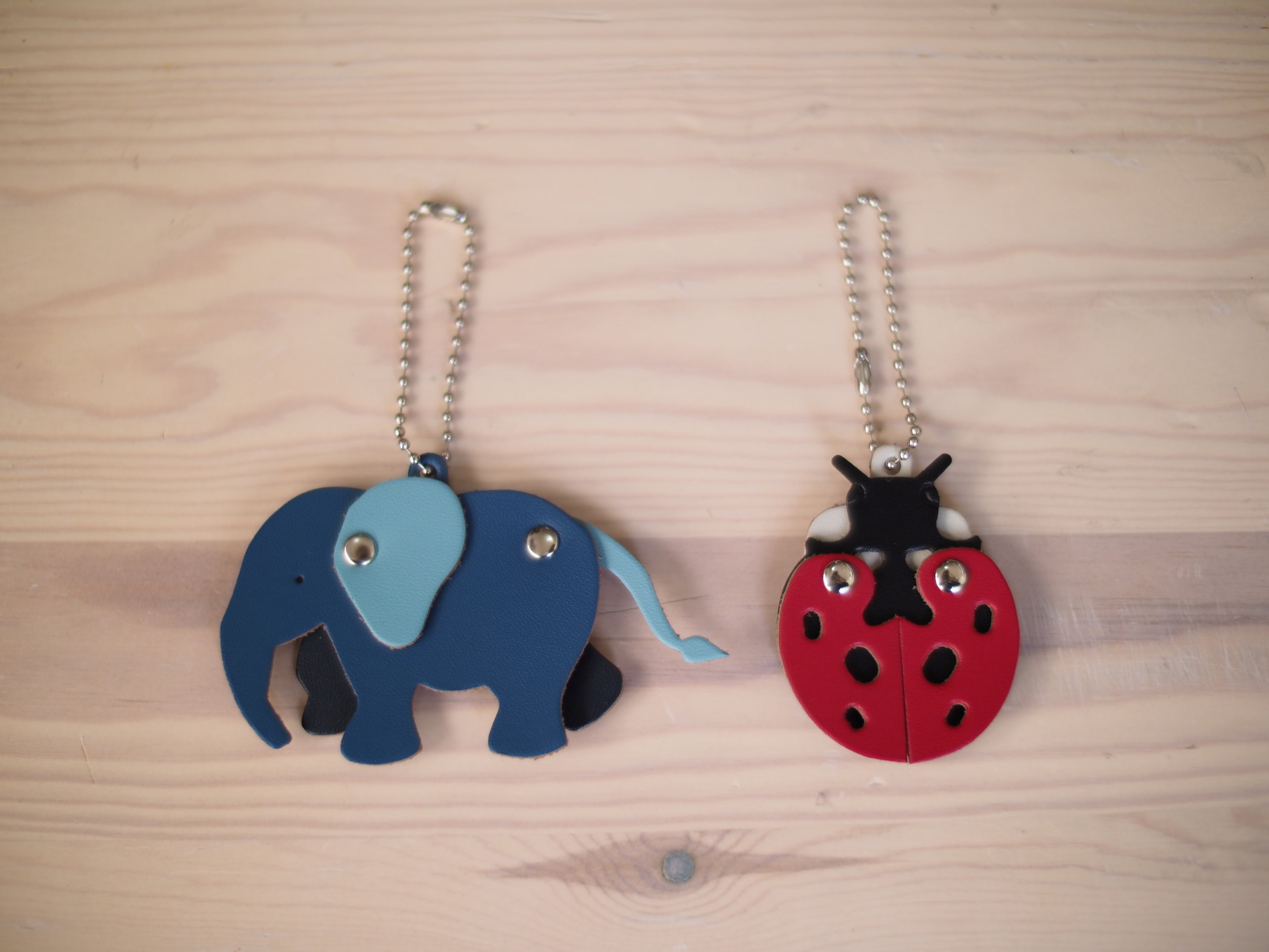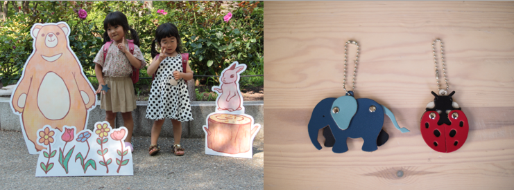 靭公園内のどこかに隠れているくまさんパネルと一緒に写真を撮ると、ランドセル返却時に職人手作りのオリジナルキーホルダーをプレゼント。ランドセルの製造過程で出る端革を使ったキーホルダーで、デザインから裁断、組立てまですべて生田のランドセル職人が手がけています。