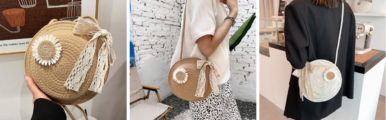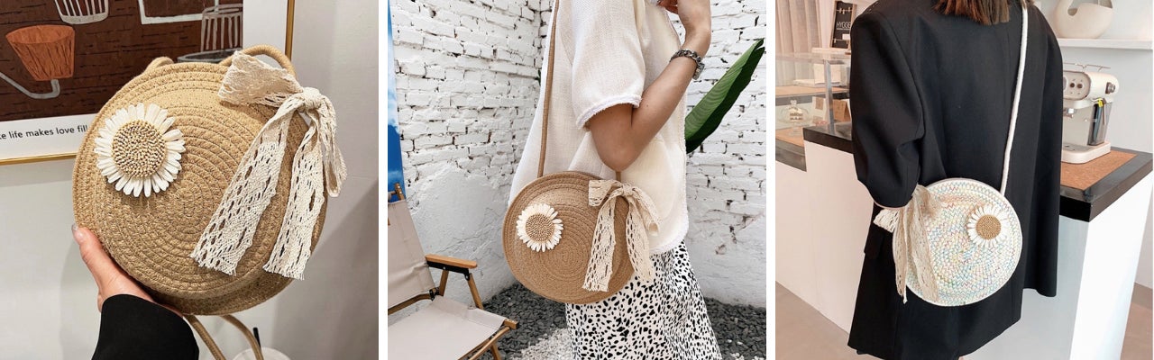 ①「まるでカンカン帽子?!」コットン丸型ショルダーバッグ 各 2,680円(税込)