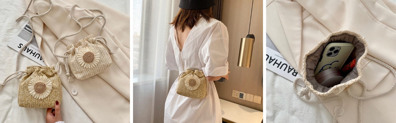 季節感たっぷりの編み込み巾着ショルダーです。