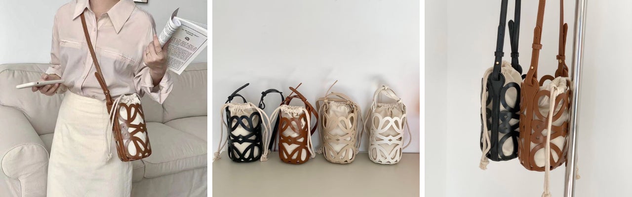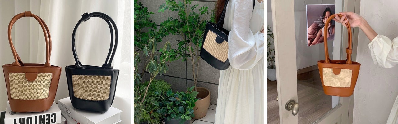 ②「肩掛けもOKの長めハンドル」バケットバッグ 各 ¥3,200円(税込)