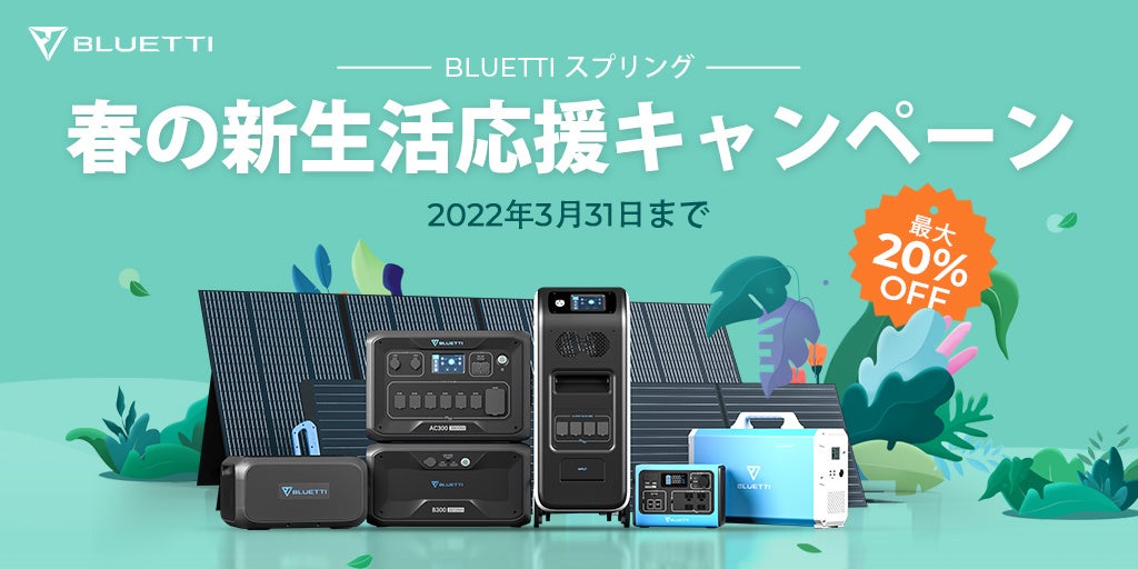 ポータブル電源市場のリーディングカンパニーとして躍進するBLUETTIは、この春に新たなステップに踏み出される方に応援する「BLUETTI 春の新生活応援キャンペーン」を3月16日(水)よりスタートします。BLUETTI公式ショップ、楽天市場、ヤフーショッピングにて、人気商品が最大20%OFFの大特価。
