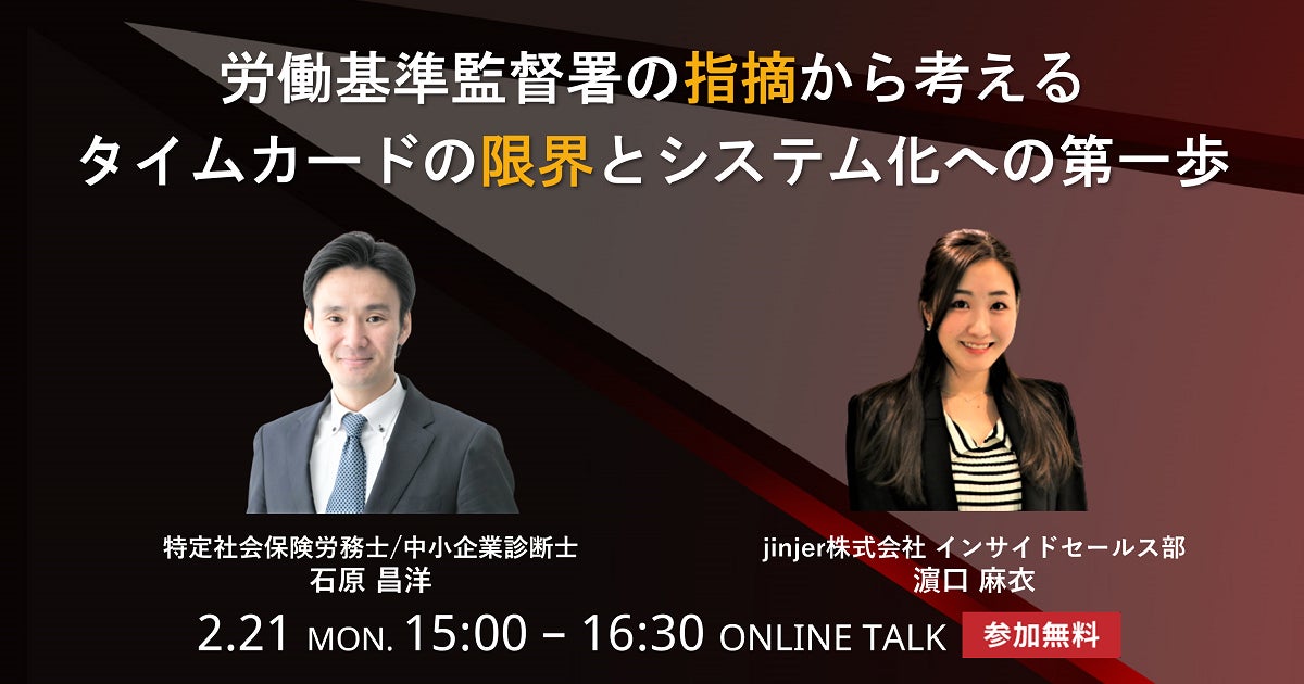 バックオフィス向けクラウドサービス「ジンジャー」を提供するjinjer株式会社(本社:東京都新宿区、代表取締役:加藤 賢)は、「社会保険労務士が事例を元に解説する労働基準監督署調査のチェックポイントと対応方法に関するセミナー」を、2022年2月21日(月)に開催することをお知らせいたします。