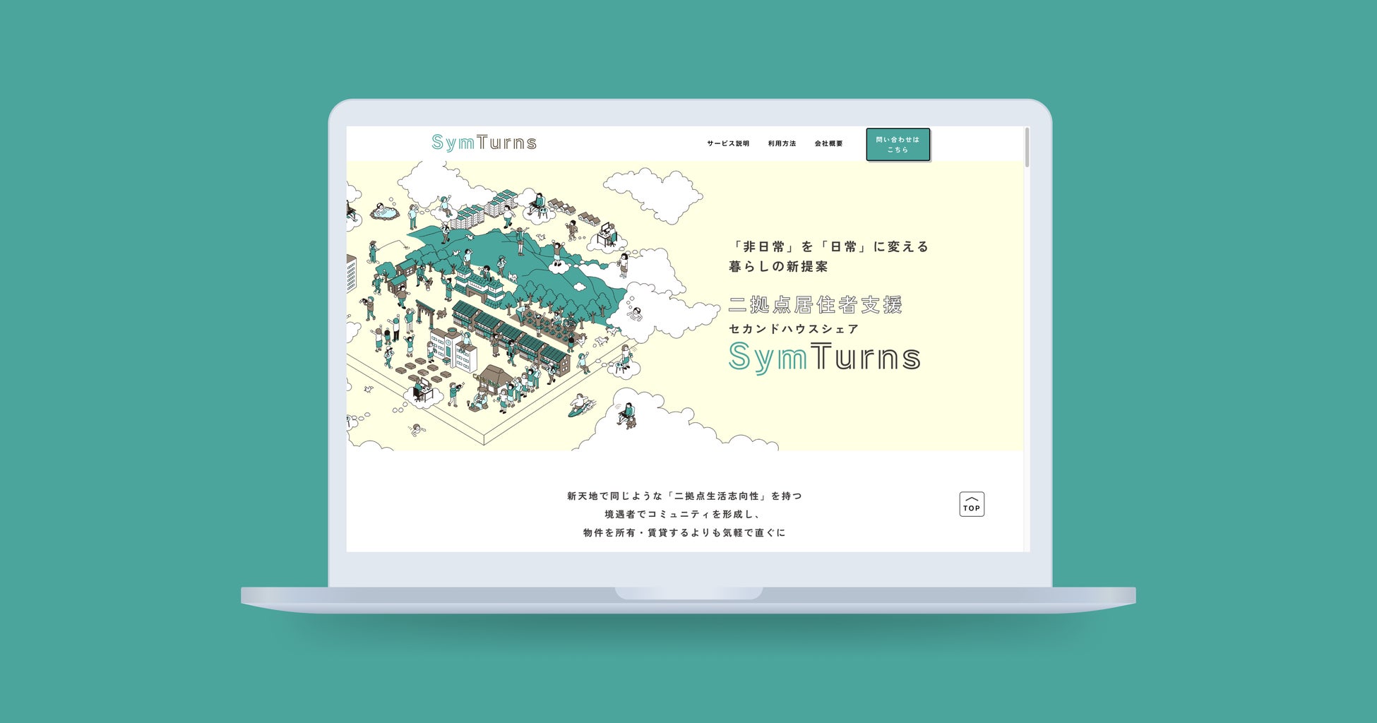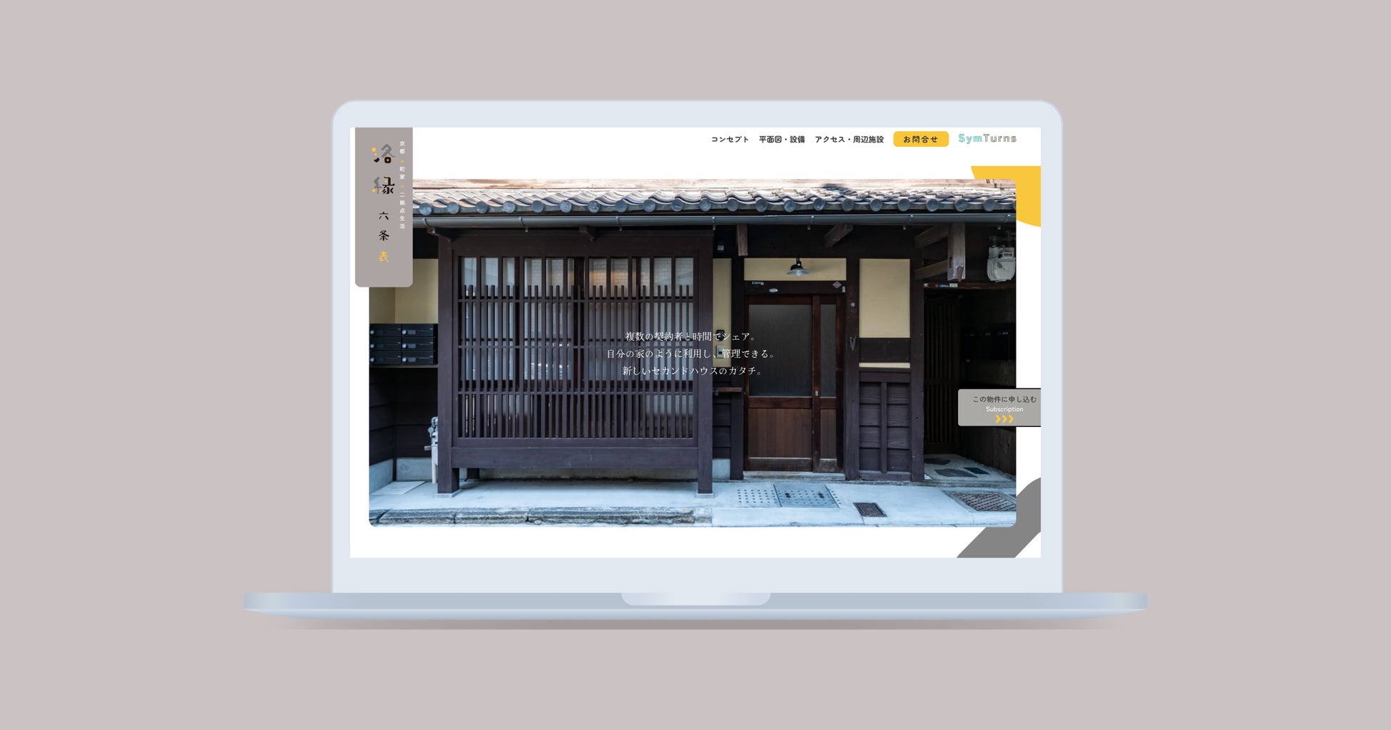 二拠点生活志向を持つ利用者で物件をタイムシェアするためのプラットフォーム「SymTurns」の物件紹介ページです。内装やアクセスなど詳しく記載することで、実際に物件へ訪れた時のイメージがしやすい構成になっています。