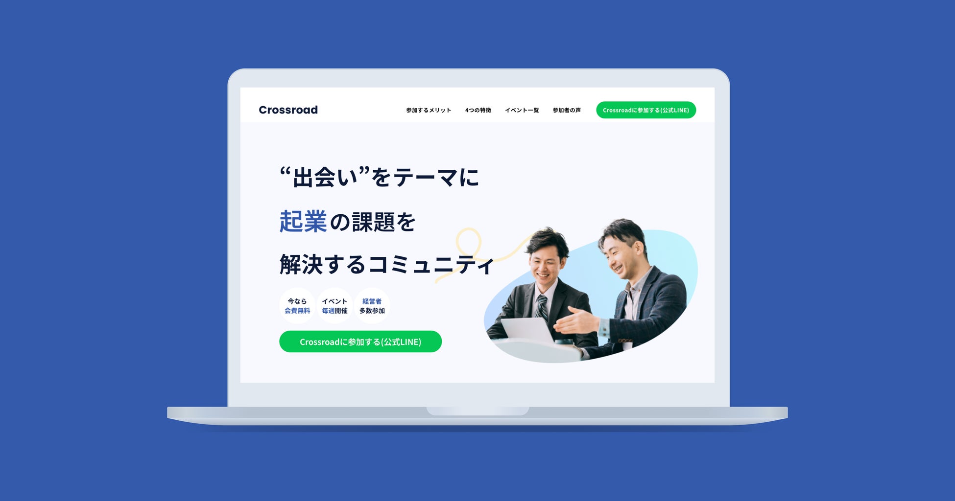 “出会い”をテーマに、ビジネスの課題を解決するコミュニティ「Crossroad」のLPです。独自のノウハウを活用し、わずか3日間での制作に成功しました。この迅速な制作プロセスにより、プロジェクト開始から公開に至るまでの期間を大幅に削減し、迅速な対応が必要な案件にも、品質を妥協することなく対応しています。