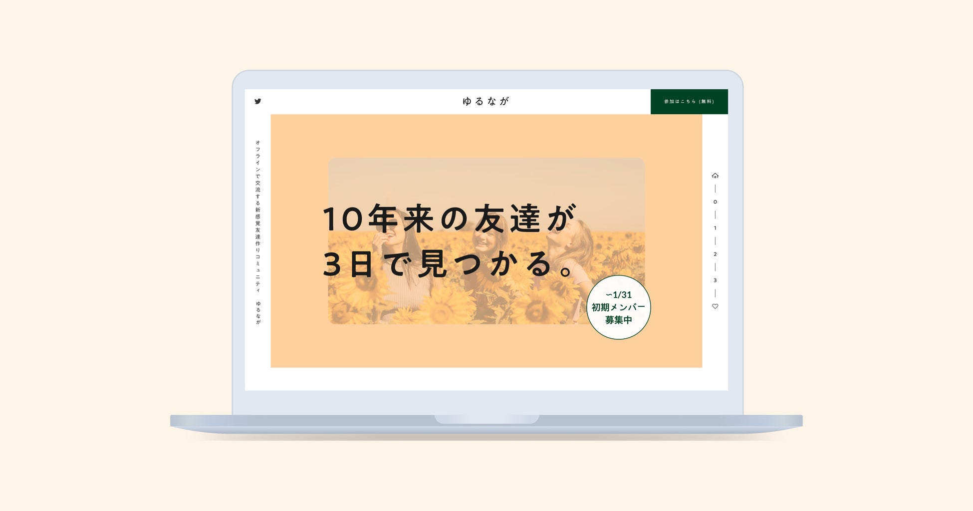 「10年来の友達が3日で見つかる。」をテーマに、友達作りの場を提供するコミュニティ「ゆるなが」のブランディングサイトです。中性的であたたかみのあるデザインにしました。