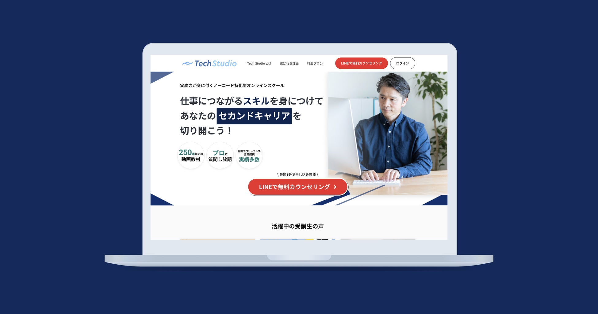 Tech Studioはノーコードエンジニアを目指す方向けに作られたオンラインスクールです。 自社サービスとしてリリースしてから30名以上の受講生を輩出し、多数の企業様にも取り入れられています。