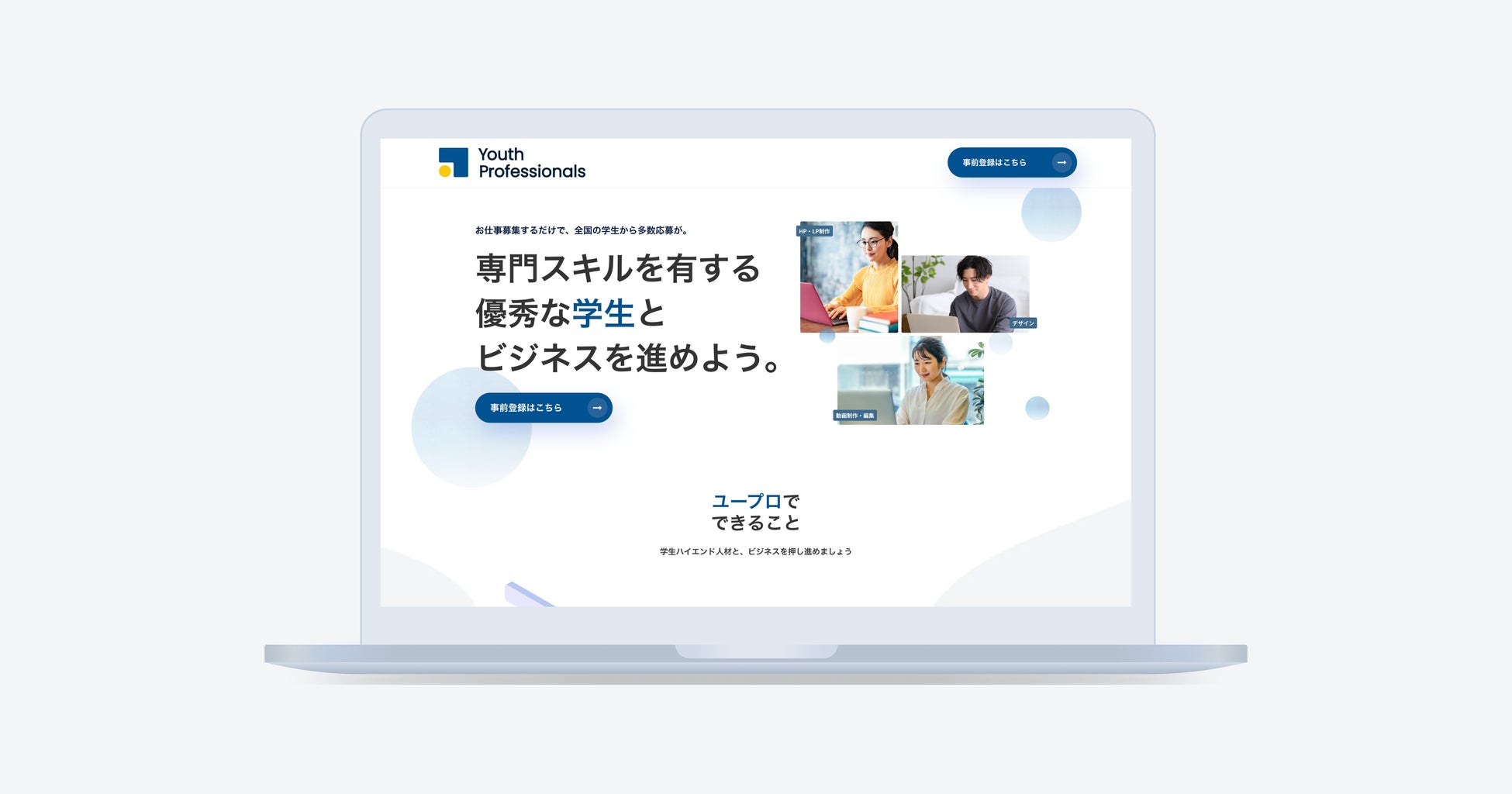専門スキルを有する優秀な学生と企業のマッチングサービス「Youth Professionals」のブランディングサイトです。新規事業として求められるスピード感に対応するために、ノーコードツール「STUDIO」を採用しました。