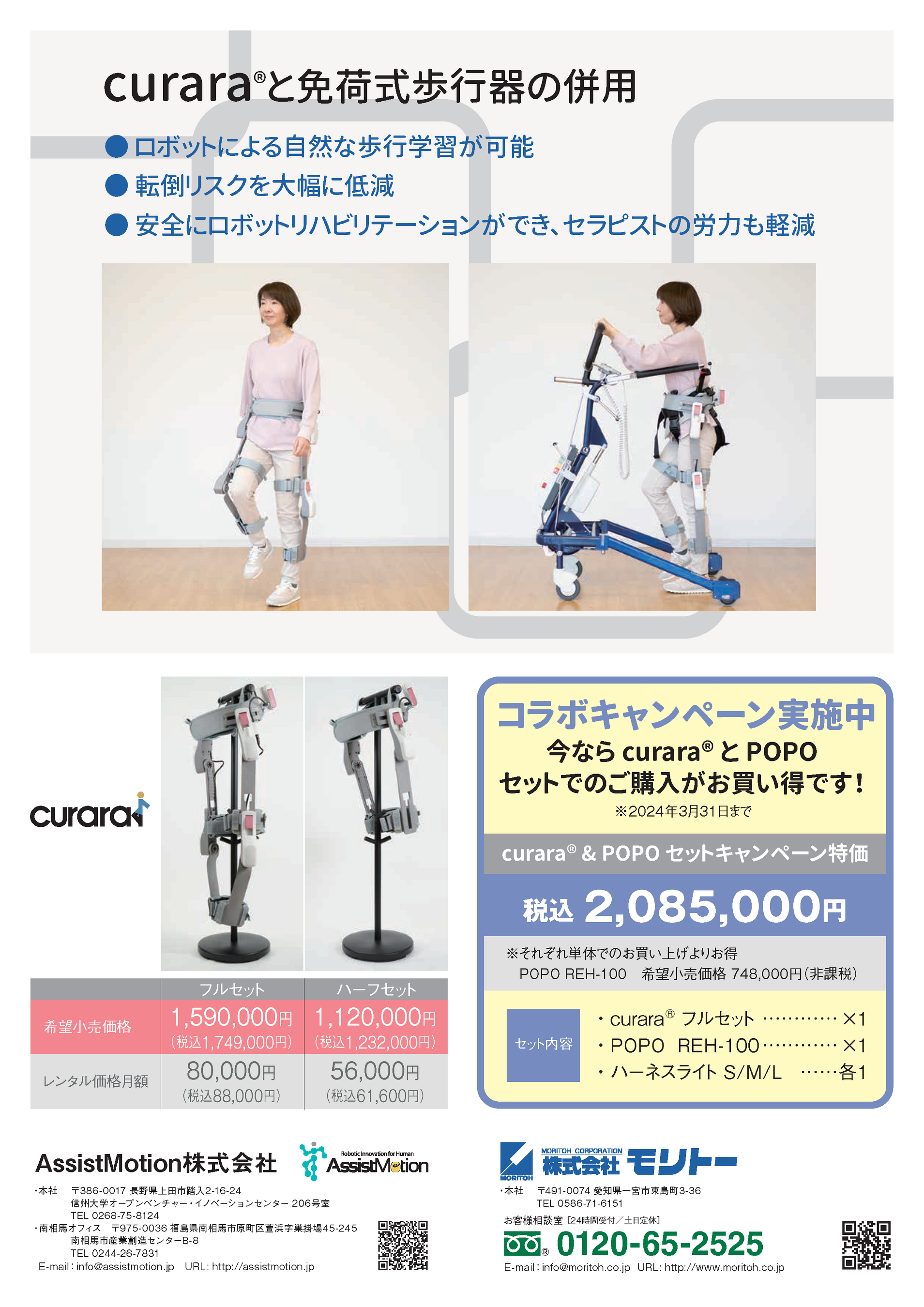 本コラボキャンペーンは、弊社製品のcurara®と株式会社モリトーのPOPOを併用することで、転倒リスクを低減しつつ、安全なロボットリハビリテーションを利用者の皆様にお届けすることを目的としています。具体的な内容は、curara® とPOPO の購入がセットにより通常価格よりもお安くお買い求めいただけます。セット内容とキャンペーン価格は以下に示します。本コラボキャンペーンの開催期間は 2023年10月1日~2024年3月31日 となっております。