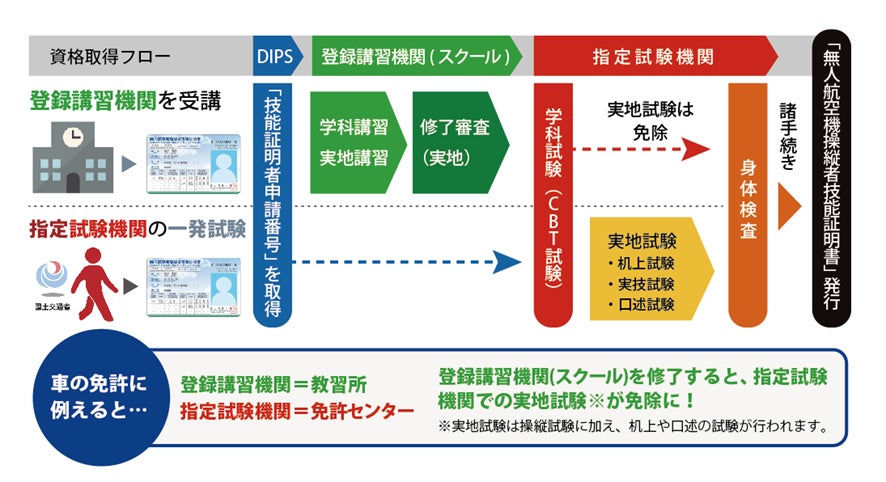 日本国内ではドローン産業の発展が推進され、身近な分野でドローンが幅広く活用されるようになってきました。ドローン国家資格を取得することで、飛行できなかった場所での飛行等が可能になり、飛行許可申請手続きも省略されるなど多様なビジネスシーンにおいてドローン国家資格である二等無人航空機操縦士の取得が推奨されております。