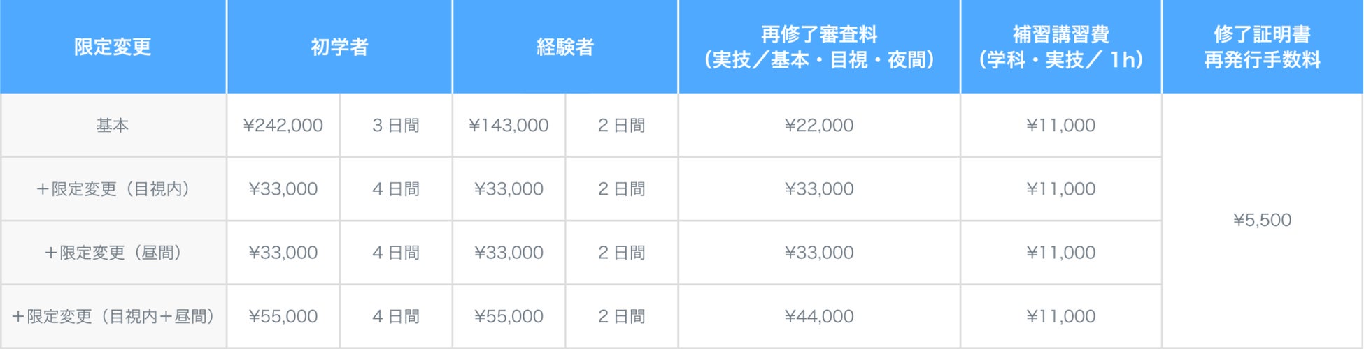 *修了審査不合格などにより補習講習が発生した場合は、上記補習講習費に準じます。