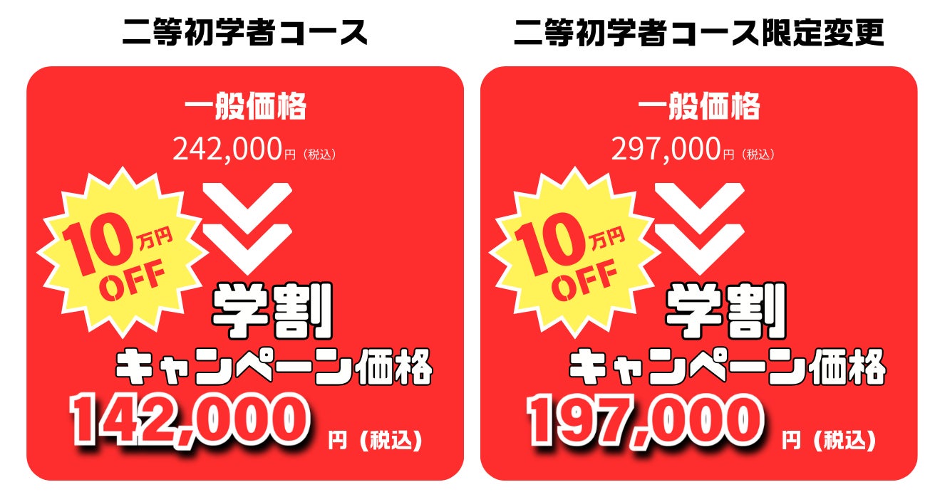 2024年7月19(金)~2024年8月31(土)に国家資格「二等初学者コース」(限定変更コースも可)をお申込みいただいた学生の受講費用を10万円(税込)お値引きいたします。期間限定となりますのでお早めにお申込みください!