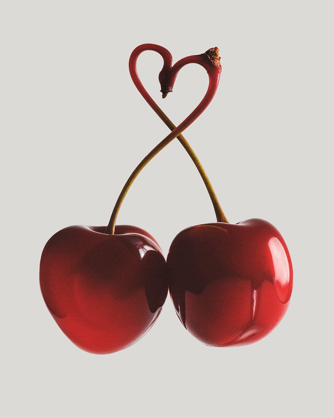 「Hug」バッグは、鮮やかな赤と黒の背景に赤い果実や花とともに撮影され、それらは2つの要素が