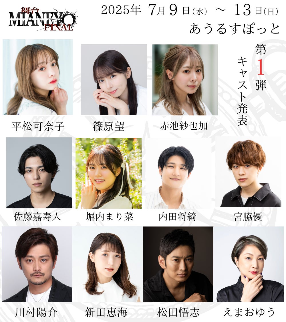 舞台をもっとたくさんの方に知っていただくために行うチケット代金無料の舞台公演を筆頭に様々なイベントや舞台を企画、制作する「株式会社あるひ 」(東京都渋谷区)の第9弾主催公演「MIANEYO~FINAL~」(7月9日~13日@あうるすぽっと)の第一弾出演者情報を公開します。