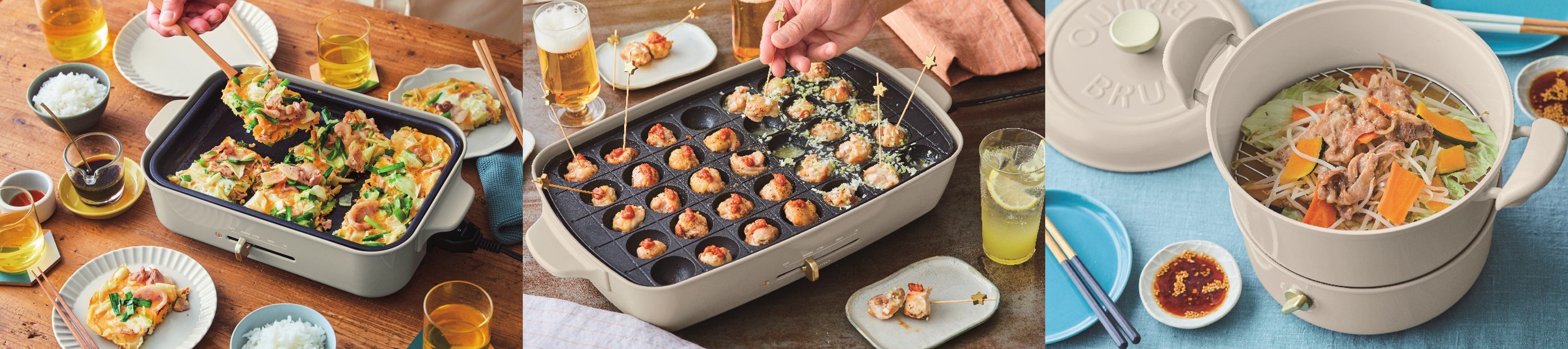 ●ホットプレート グランデサイズ:みんなでつくって愉しめる週末ごはん「おうちひと口焼き鳥」●マルチグリルポット:忙しい日に助かる時短メニュー「漬け込み豚と野菜蒸し」