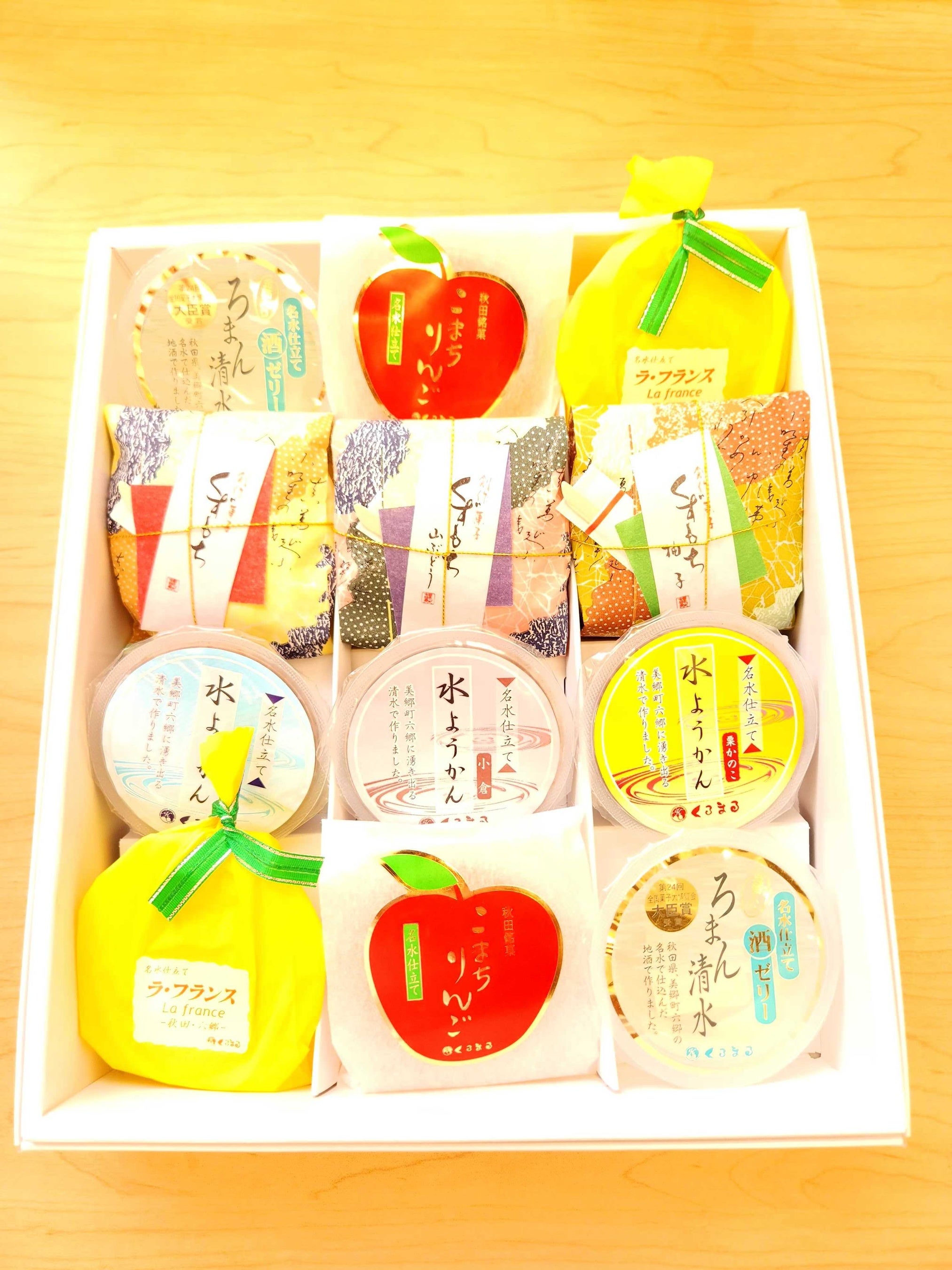 水ようかん(小倉・こしあん・栗かのこ 各1個)、くずもち(プレーン・山ぶどう・柚子 各1個)、ゼリー(こまちりんご・ラ・フランス・ロマン清酒 各2個)