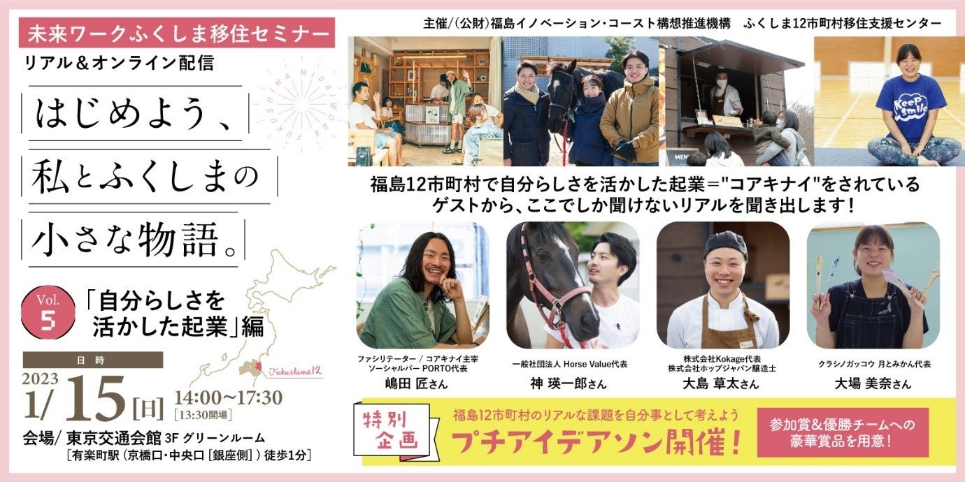 イベント全体概要(公財)福島イノベーション・コースト構想推進機構ふくしま12市町村移住支援センターは、12市町村で働くこと、生活すること、チャレンジすることを検討されている方に向けた、移住セミナー『はじめよう、私とふくしまの小さな物語。』を開催します。
