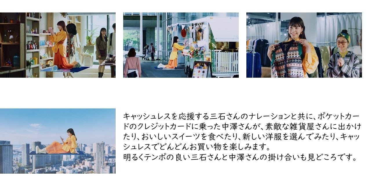「はじめまして中澤実子です。今回起用いただきとても嬉しかったです!ポケットカードに乗って風を切りながら、身軽にお買い物していくシーンでは撮影の時からワクワクしました。そんな軽快さやワクワク感が皆さんに伝われば嬉しいです。」