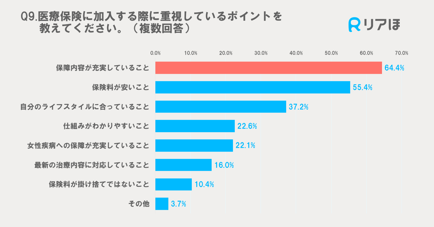 「保障内容が充実していること」が最も多い。次いで、「保険料が安いこと」の順。