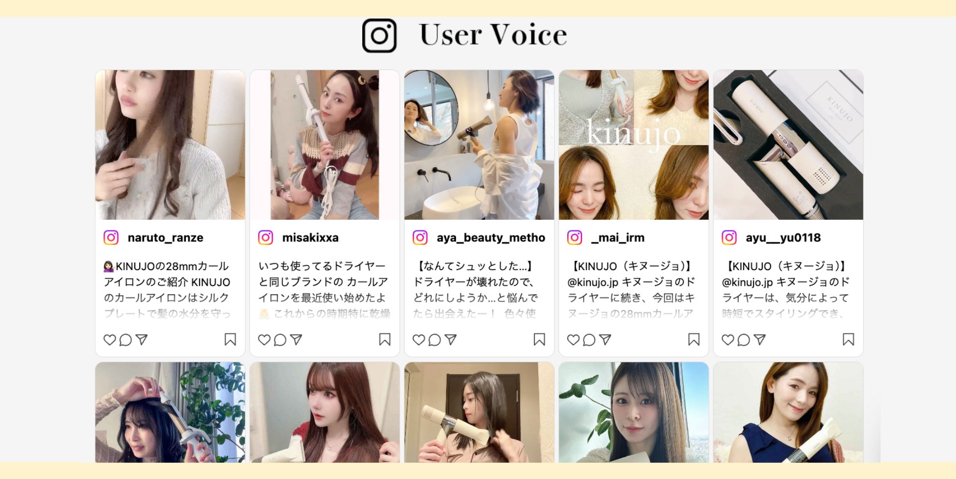 ・UGCクリエイティブとECキャスティング導入後の成果:KINUJOヘアアイロンやヘアドライヤーなどの各LPに、ECキャスティングで生成したTikTokの縦型ショート動画やInstagramの動画UGCをUGCクリエイティブで収集、掲載、分析、改善することで、CVR向上&工数削減に成功。