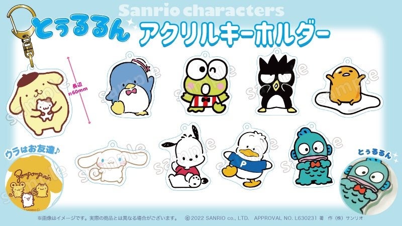 ラインナップ(全19種):ハローキティ、リトルツインスターズ、KIRIMIちゃん.、ウィッシュミーメル、マロンクリーム、ウサハナ、マイメロディ、クロミ、マイスウィートピアノ、こぎみゅん、ポムポムプリン、タキシードサム、けろけろけろっぴ、バッドばつ丸、ぐでたま、シナモロール、ポチャッコ、あひるのペックル、ハンギョドン