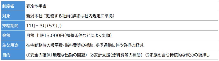 オーエムネットワーク株式会社(本社:新潟県/以下、当社)は、今冬(11〜3月)の5カ月間、新潟本社に勤務する社員を対象に「寒冷地手当(最大13,000円/月)」を新設します。雪の多い冬季の通勤困難や燃料費高騰による家計負担に対応し、在宅勤務時の暖房費等を補助。「無理な出勤をさせない」「家族の支えに報いる」という方針のもと、冬季の安全と働きやすさを両立させます。