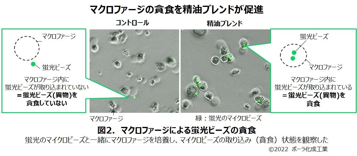 「免疫細胞であるマクロファージによる異物の貪食(※1)が、精油ブレンド(※2)により活性化すること」