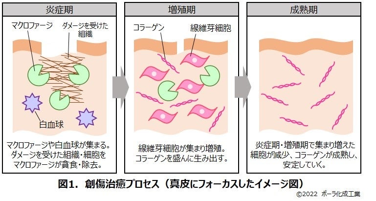 皮膚をはじめとするあらゆる組織には、傷ついたときに自ら治癒する「創傷治癒機能」が備わっています。その過程では、ダメージを受けた組織や死んだ細胞、雑菌などを、「マクロファージ」を中心とした免疫細胞が異物として貪食し、除去します(図1)。これは治癒過程において大切なステップですが、マクロファージの貪食能は、加齢などの要因により低下してしまうことが知られています。そこでポーラ化成工業では、創傷治癒を円滑に進め、いつでも健やかな肌を保つことが可能となるよう、マクロファージの貪食能を促進する手段の探索を行いました。