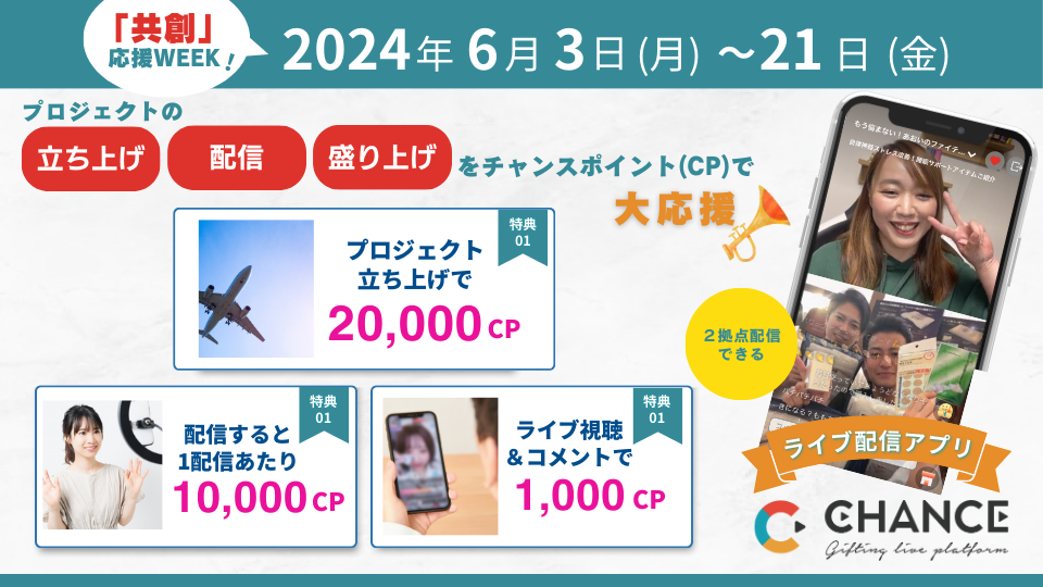 「プロジェクト立ち上げ」「ライブ配信」「コメント」で最大20,000CP(チャンスポイント)プレゼント!