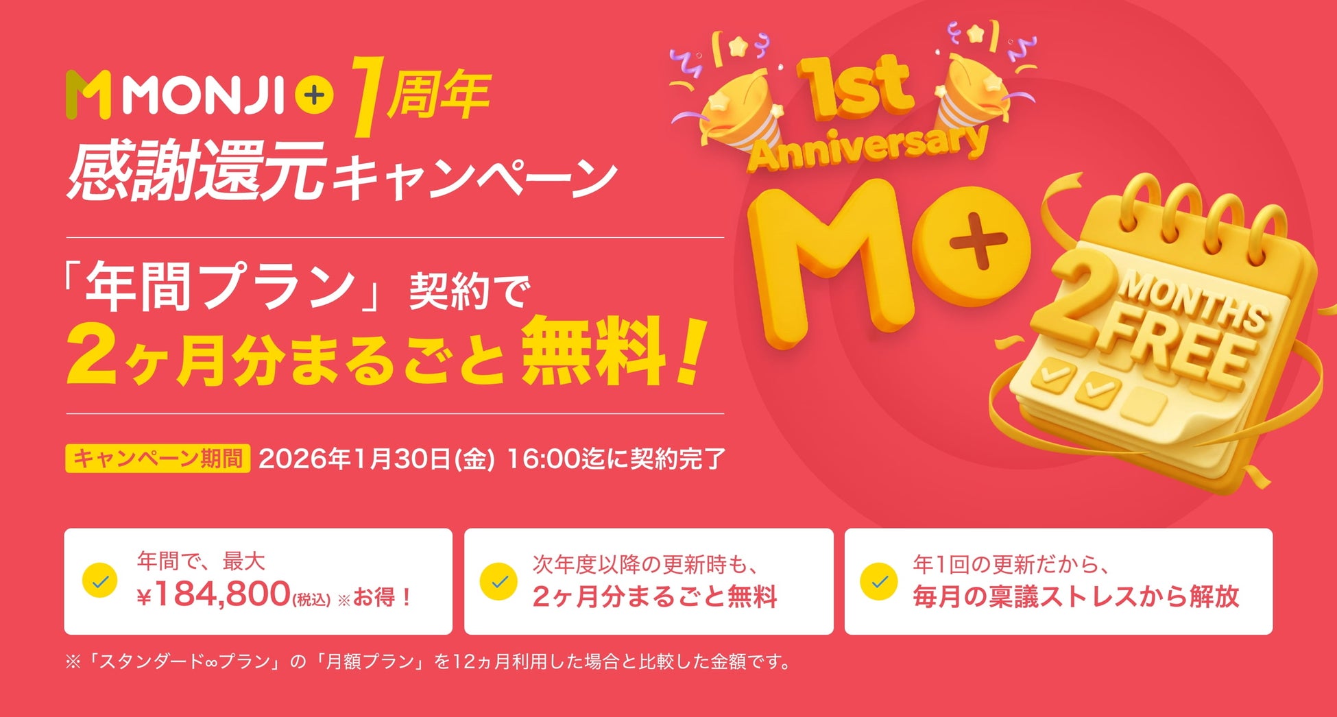 Webサイト運用支援プラットフォーム【MONJI+】が期間限定キャンペーンを実施。2026年1月30日(金)16:00まで「年間プラン」契約で利用料金が2ヶ月分まるごと無料に