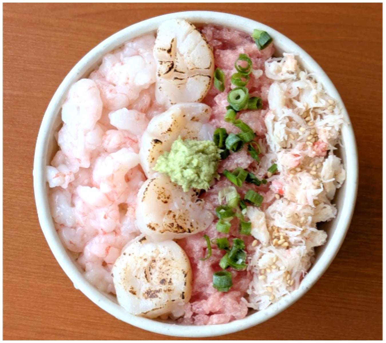 ねぎとろ、甘エビ、炙りホタテ、蟹を組み合わせたバラエティ豊かな丼です。