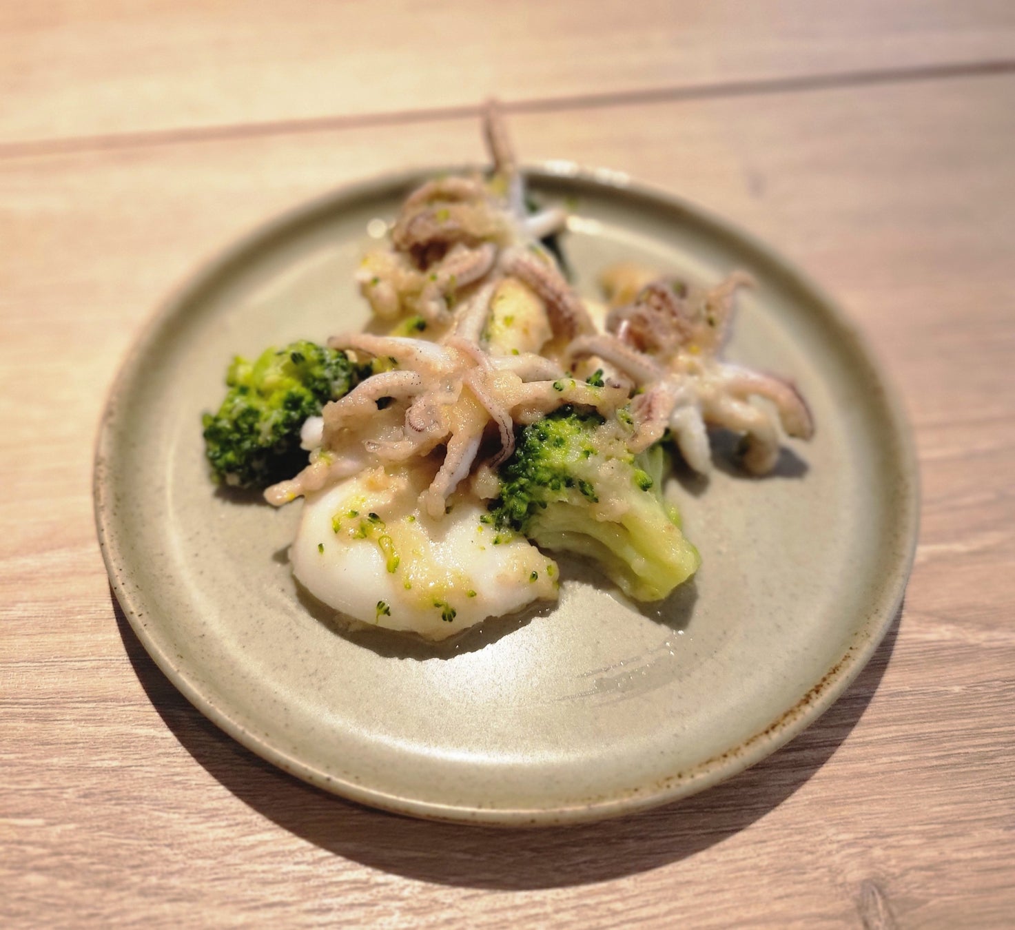 新鮮なヤリイカと、色鮮やかなブロッコリーのソテー。