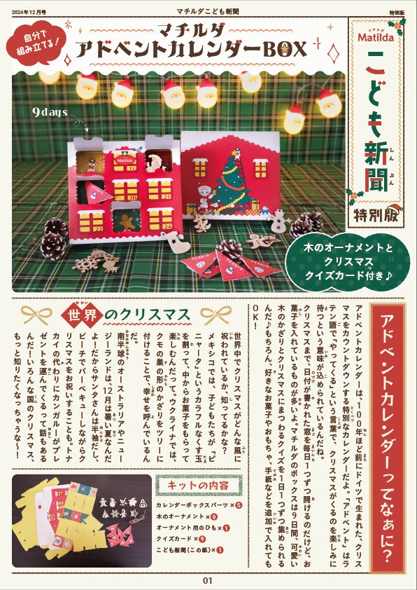 また、同封する「こども新聞」 には、アドベントカレンダーの文化や世界のクリスマスについて学ぶコラムをご紹介。作って楽しいだけでなく、クリスマスをきっかけに親子の楽しい会話が弾む、特別な時間を提供します。