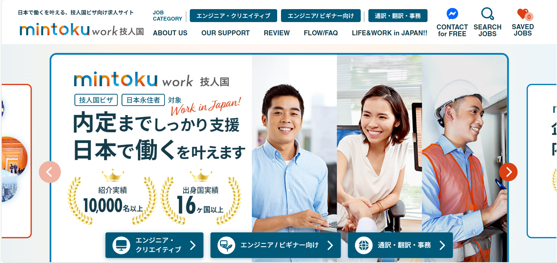 先行提供していた関連サイト「Mintou Work」では、特定技能を中心に、技人国、定住者、留学生なども含めて総合的に外国人材向けの求人紹介を行い、企業への紹介実績累計10,000名以上、出身国別内定実績16カ国以上をサポートしてきました(*1)。その実績を元に、注目度の高まる「技人国」と「特定技能」に向けたサイトとして特化し、より専門的なサポートを行います。