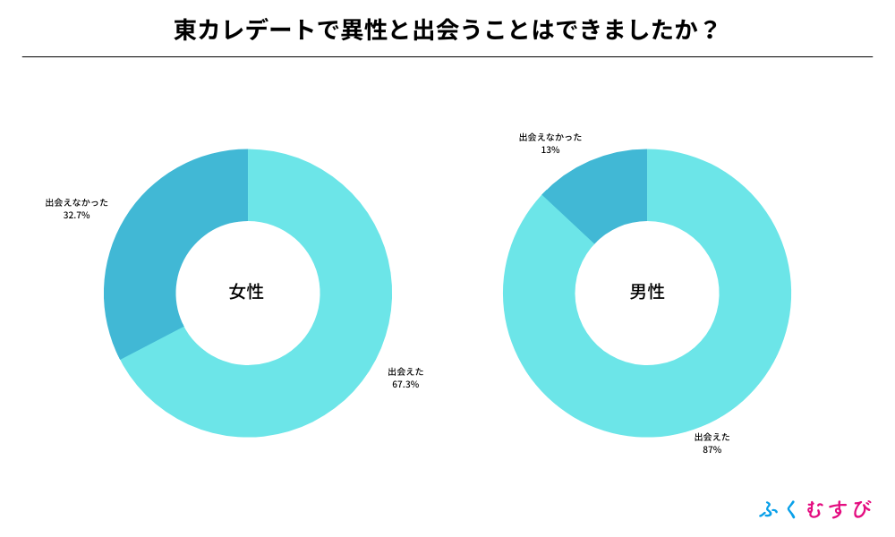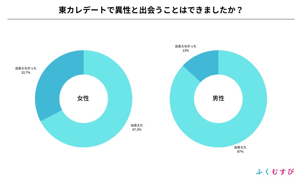 ・東カレデートで異性と出会えた割合は、男性が87%、女性が67.3%となりました。