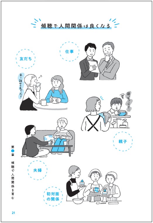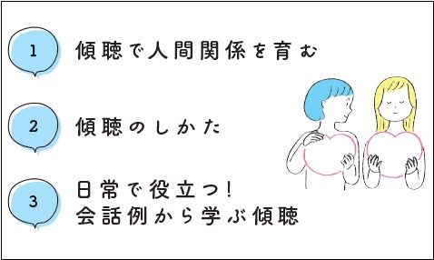 そんな悩みをサポートし、人とのコミュニケーションを円滑にするものの一つに「傾聴」があります。傾聴は、職場、友だち、夫婦、親子、初対面の相手…、どんな人間関係にも役立てることができるのです。