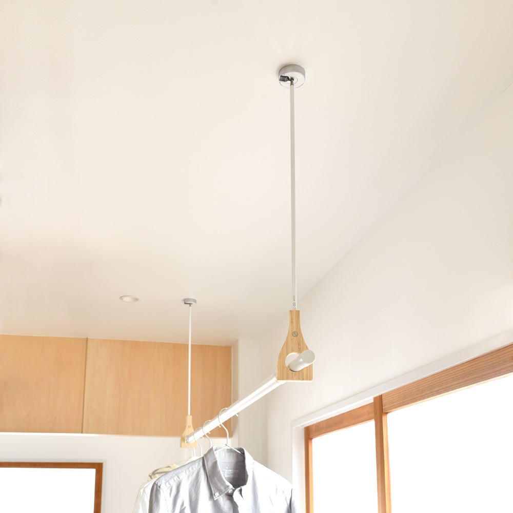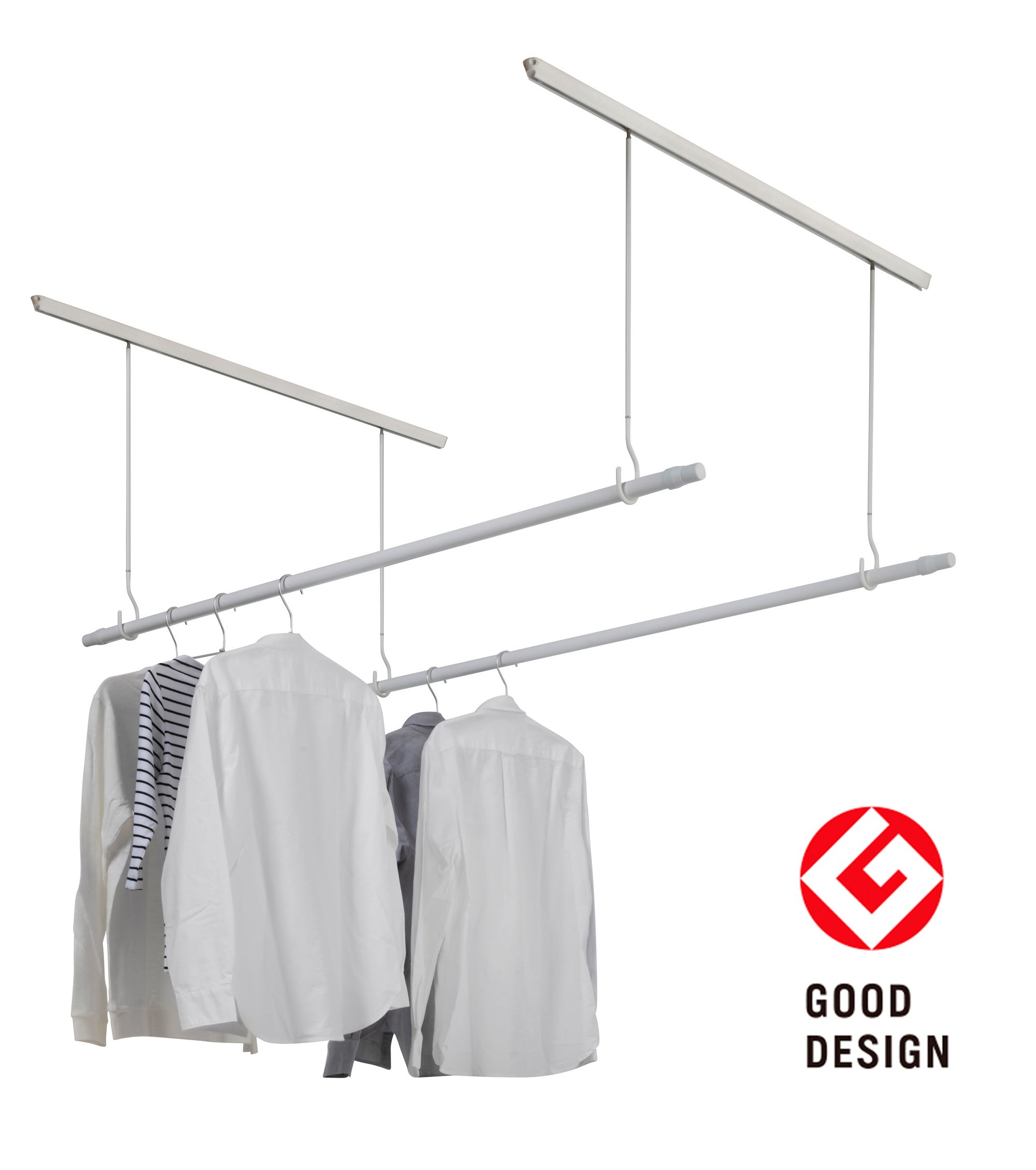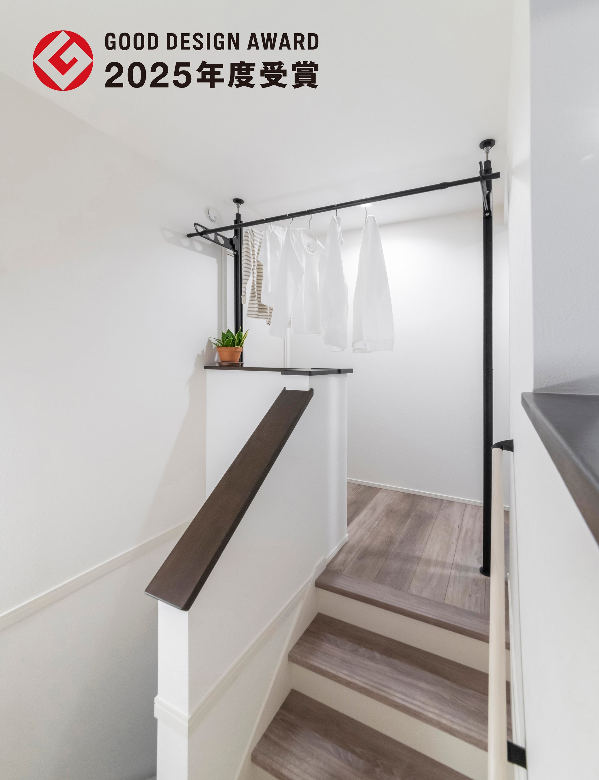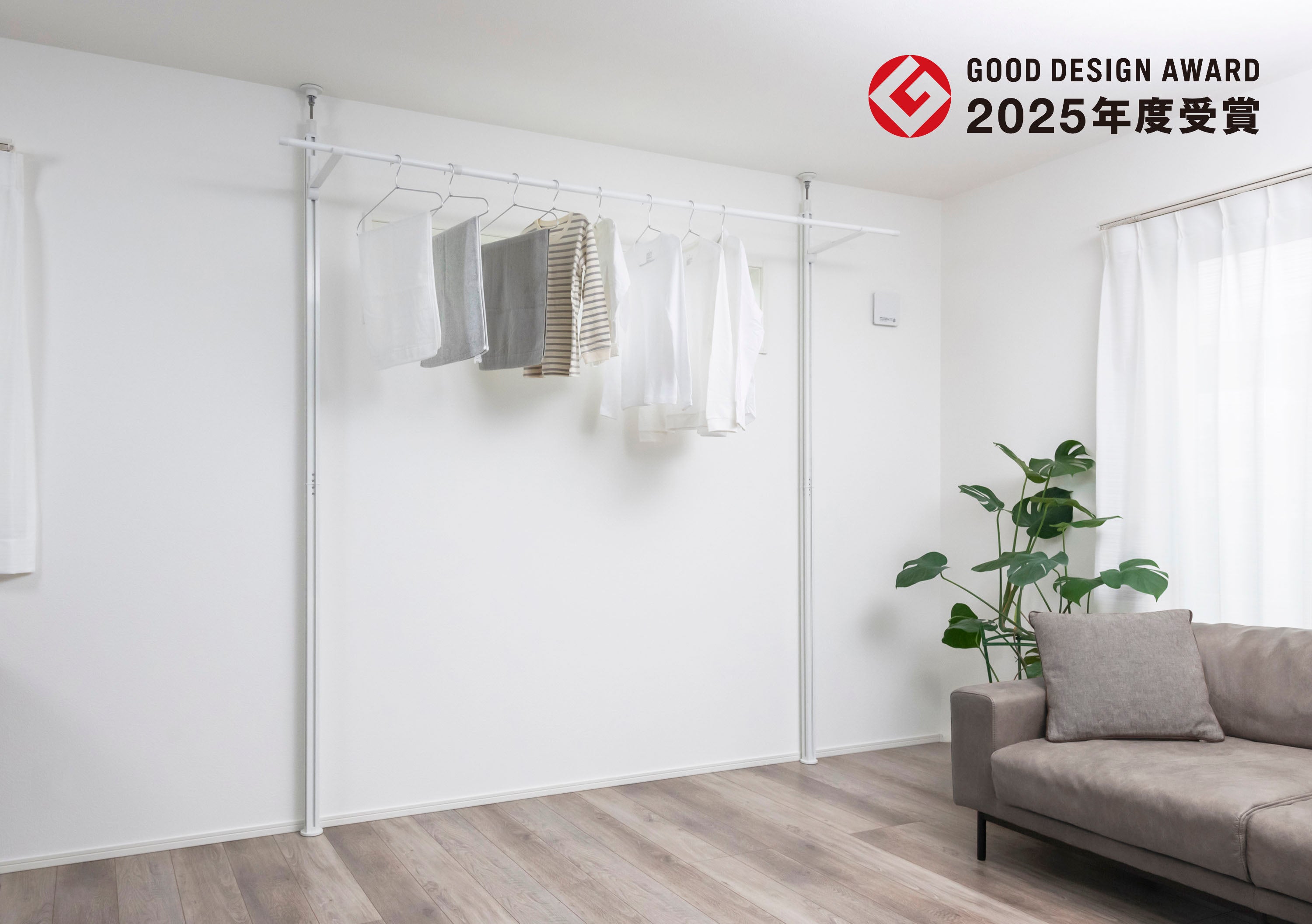 様々な要因で洗濯物を部屋干しするニーズが高まっている。一方で、室内に洗濯物を干す事を想定した日本の住居は少ない。そこで、床置きや天井突っ張り構造の洗濯干しが市場にあるのだが、どうしても室内が煩雑になる。この製品はそんな状況に正面から向き合い、多彩な工夫が凝らされている。四角い断面のアルミ押出し成形で作られた堅牢な柱は、突っ張り棒が持つ仮設的な印象を払拭し、一般的な丸パイプの製品よりも静かに空間に馴染む。自社で展開している様々な屋外用物干し金物をそのまま使える様にデザインされているので、ユーザーの様々なニーズに過不足なく応えられるのも魅力だ。
