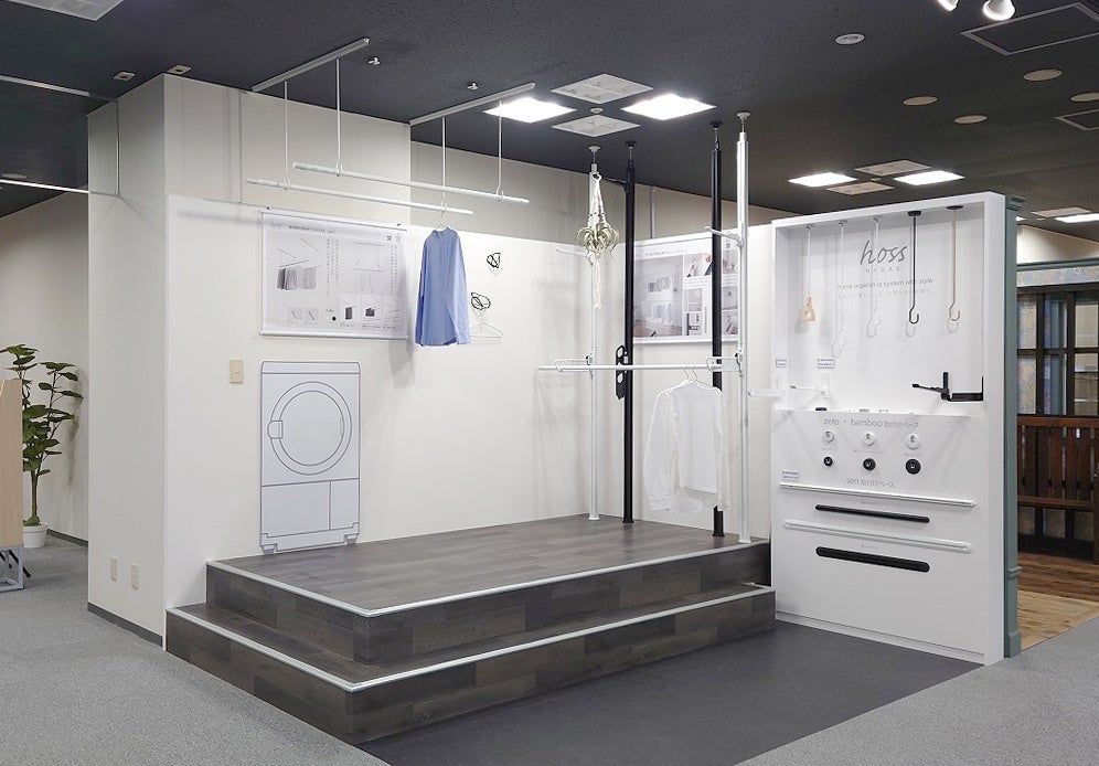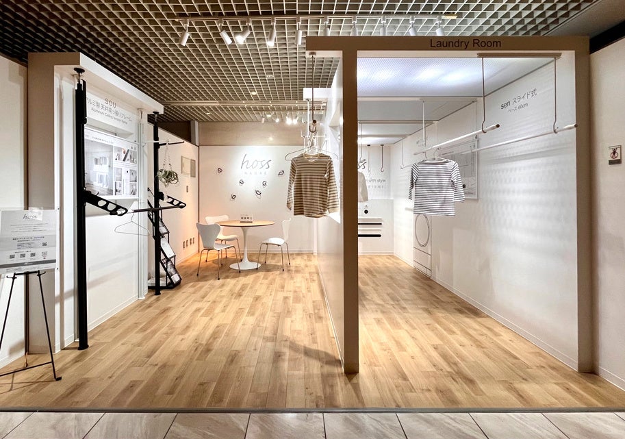 「hoss NAGAE Space TOKYO」「hoss NAGAE Space OSAKA」では、シンプルモダンなデザインと機能性を備えた物干し金物・天井突っ張りフレーム・壁面フックを中心に、“暮らしをととのえる”プロダクトを展示しています。ランドリールームを想定したシーンで、動作や操作感を実際に体験していただける構成です。