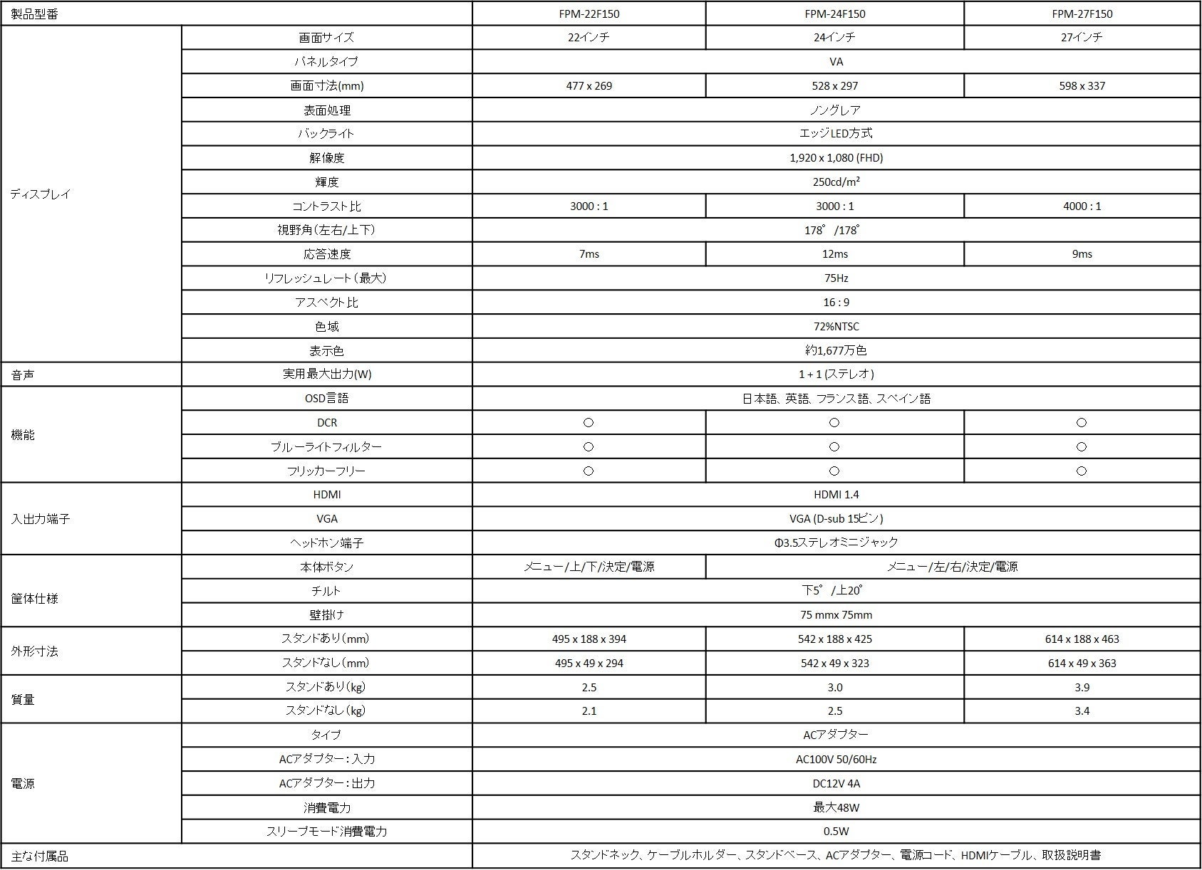 「F150」シリーズは、27型、24型、22型の3サイズを展開しているため、用途に応じたディスプレイサイズを選ぶことができます。また狭額縁フレームレスで、スタイリッシュなデザインとなっています。そのため、モニターを複数台並べて使用するマルチディスプレイにも適しており、作業効率をより一層高めます。解像度はフルHD、パネルはVAパネルを採用したことで、コントラストの高いメリハリのある映像を表示し、文字もくっきり見やすいため、ビジネスやテレワークに活躍するモニターです。