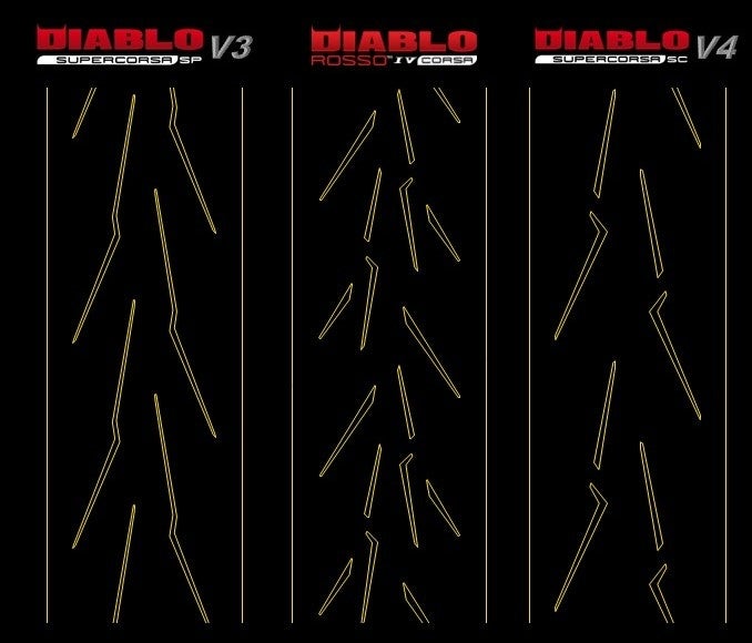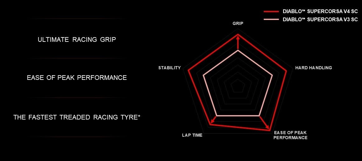 DIABLO™ SUPERCORSA V3 と比較して、DIABLO™ SUPERCORSA V4 は、新しいトレッドパターン、新しいコンパウンドとコンパウンドレイアウト、新しい構造、新しいプロファイルを備えています。