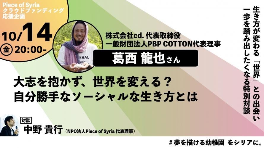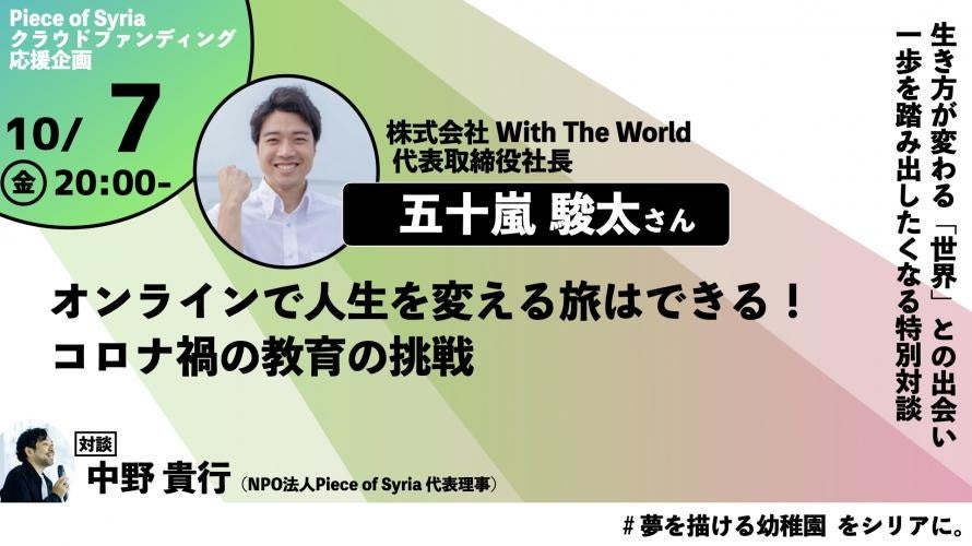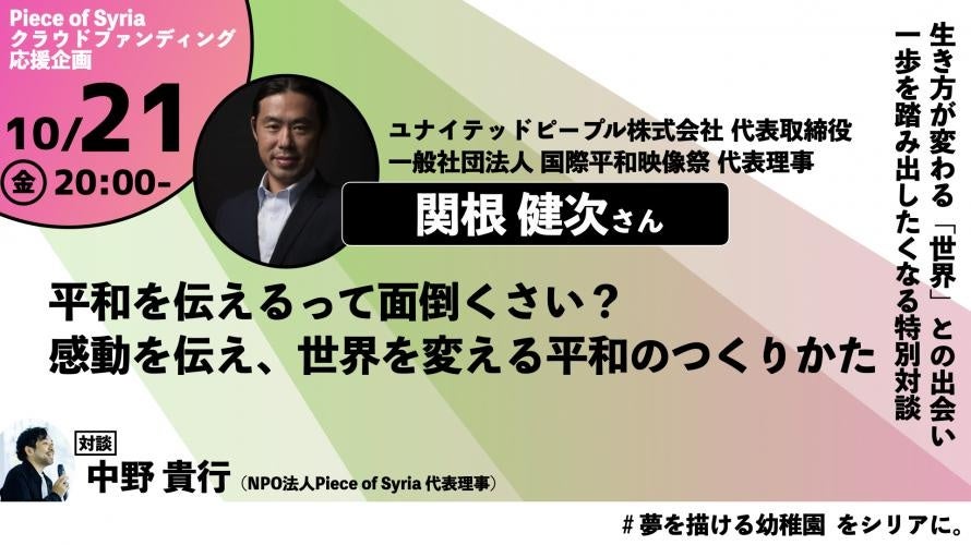 「シリアをまた行きたい国にする」を目標に、シリア及びトルコで2000名以上の子どもたちに教育を届けてきたNPO法人Piece of Syria(代表 中野貴行、以下「Piece of Syria」)は、実施中のクラウドファンディングにあわせて、10/7から3週連続で旅×教育、SDGs×ビジネス、平和×映画をテーマにした対談イベントを実施いたします。