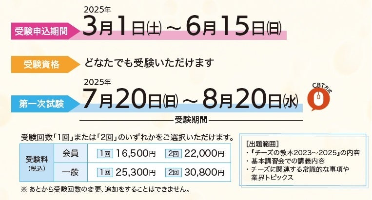 申し込みは3月1日から6月15日までの期間、チーズプロフェッショナル協会WEBサイトの認定試験ページで受け付けています。(受験申し込みにはアカウント登録が必要です)