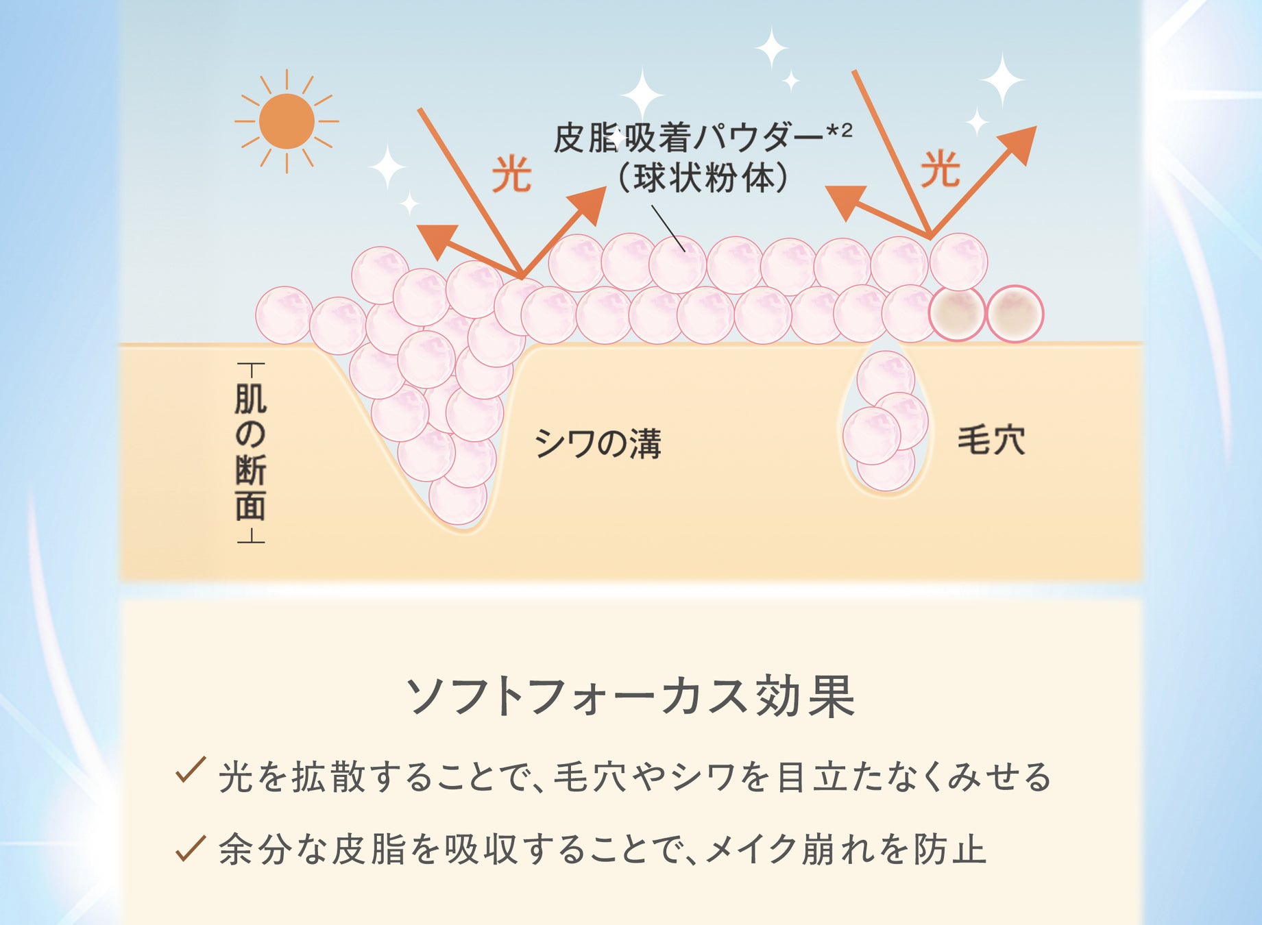 皮脂吸着パウダー※が毛穴の凹凸にフィットし、肌表面を均一に整えることで、光を反射しやすいツヤ肌を実現します。※(ビニルジメチコン/メチコンシルセスキオキサン)クロスポリマー