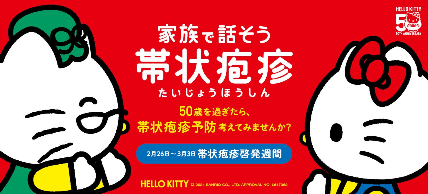 その一環として、今年の帯状疱疹啓発週間では、株式会社サンリオのキャラクターで50周年を迎えた「ハローキティ」とコラボします。「家族で話そう、帯状疱疹。」をテーマに、期間中、ハローキティとおばあちゃんのマーガレットとの対話をモチーフとしたオリジナルイラストを本ウェブサイトやデジタル広告で公開します。世界的な人気を集めるハローキティとコラボしたこのたびの帯状疱疹啓発週間が、ご家族など身近な方々と予防の大切さについて話し合うきっかけになることを願っています。