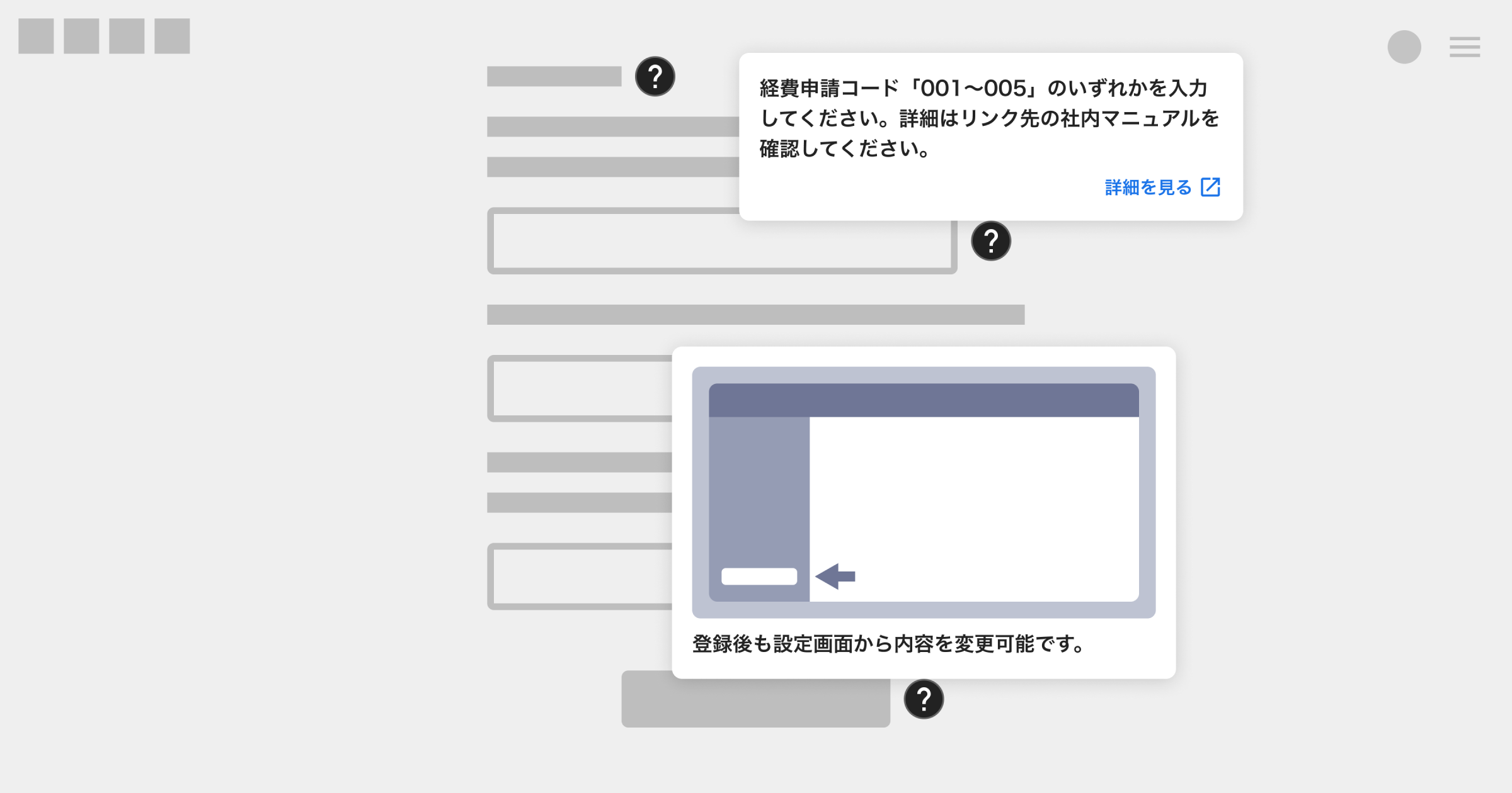 システムやツールの利用時、操作でつまづきやすい場所にハテナボタンを設置できます。